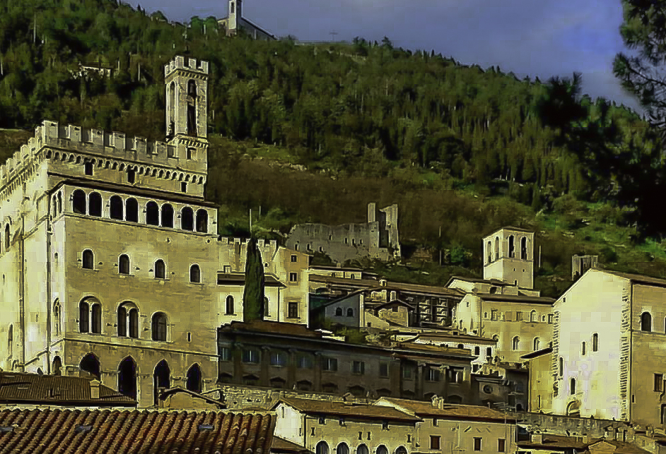Nel XII secolo la città posta in pianura si contrasse e l’abitato iniziò a svilupparsi sulle pendici del Monte Ingino, dove vennero edificati i luoghi strategici dell’esercizio del potere e della vita spirituale, la cattedrale e il palatium communis, l’antico palazzo comunale.