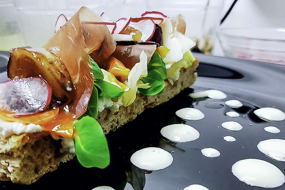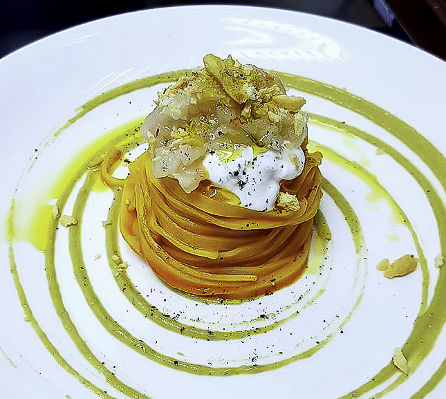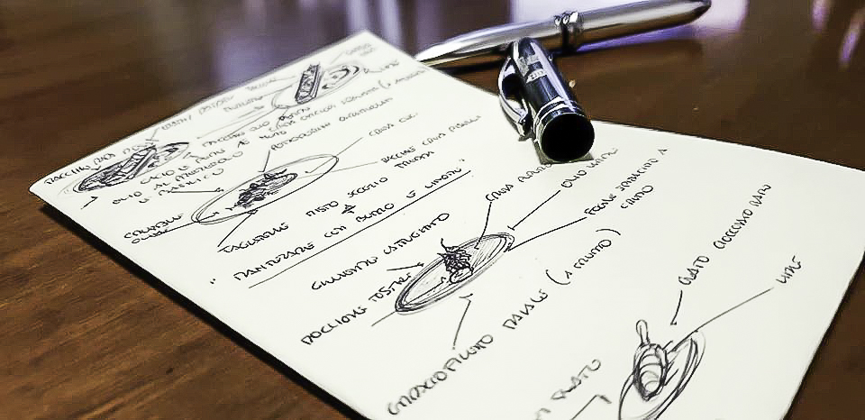 Mattia: i miei piatti partono sempre da una base, da uno spunto tradizionale. Da lì poi amo rivisitare, dare un qualcosa in più, un mio tocco, e cerco allora di immaginarmi il piatto in bocca, i suoi sapori e le sue sensazioni. Me lo immagino e penso…ora serve il cremoso, poi il croccante…il dolce, l’amaro…e vado quindi in cerca di un equilibrio. A questo punto studio e scelgo come impiattare: prendo carta e penna e lo disegno. Cerco di costruirlo mentalmente, perché non solo la bocca deve essere appagata…